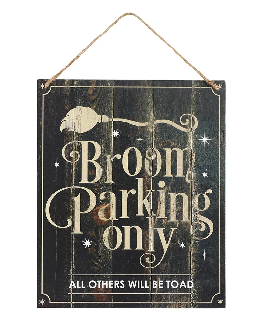 Platziere das Hexenbesen Parken Hängeschild gut sichtbar, damit es auch jeder sieht. Schließlich soll jeder lesen können, was auf dem Halloween Deko Schild geschrieben steht: Broom Parking only – Hier parken nur Hexenbesen. Und darunter steht als Warnung: All others will be toads – Alle anderen werden Kröten. Das sollte ausreichen. Die Schrift steht auf einem schwarzen Schild, das aussieht, als wäre es aus zusammengezimmerten Brettern hergestellt und dann liebevoll beschrieben worden. Im Grunde ist es das auch. Das Hexen Türschild für Halloween ist aus MDF Holz und verbreitet einen wunderbaren Halloween Vintage Look.