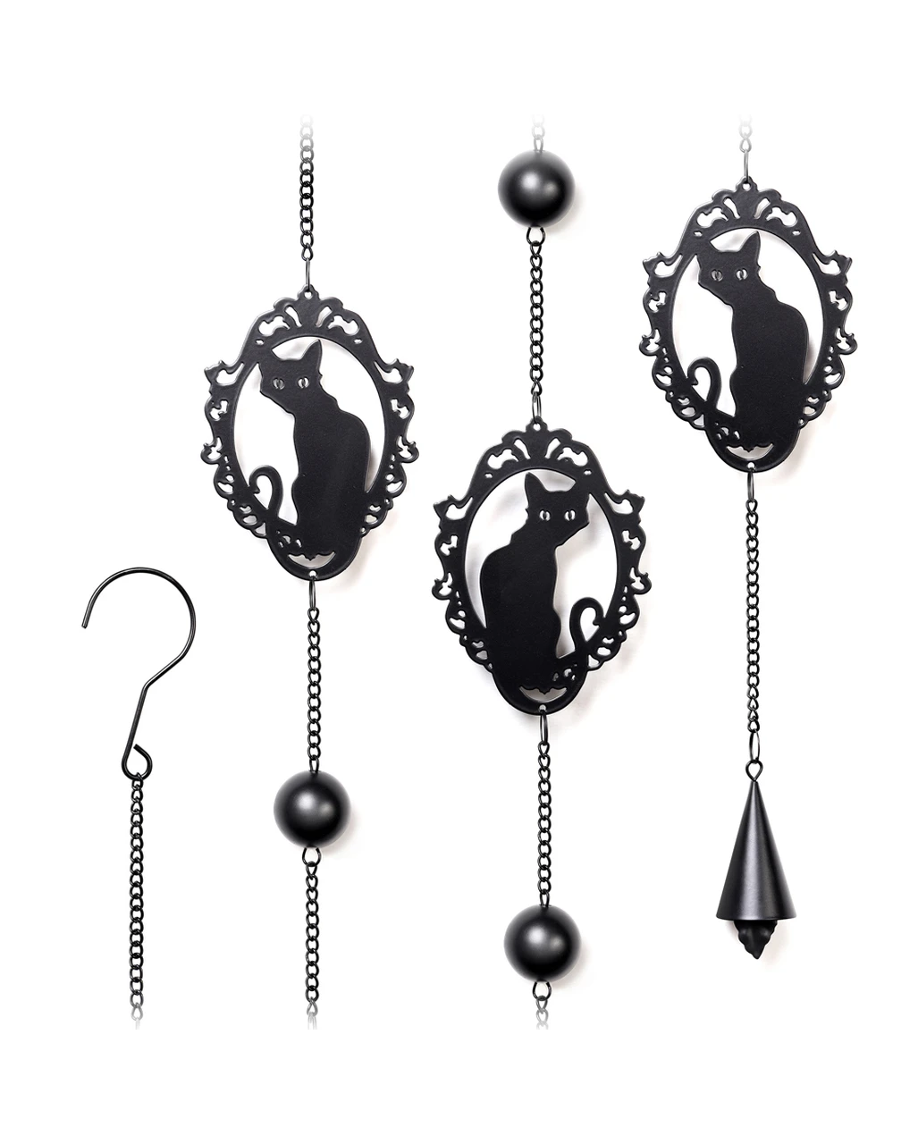 Unsere Katzen Windspiel Hängedeko lässt sich dank des Hakens ganz einfach an der Decke oder Wand befestigen. Die matt-schwarze Legierung der Figuren sorgt für einen stylischen Look. Auch als Gothic Geschenkidee kann unser Katzen Mobile überzeugen. Lass dir auch das Salem Magierkatze 32,5cm nicht entgehen.