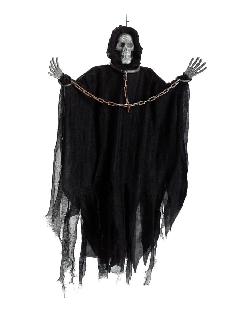 Die Skelett in Ketten Hängefigur ist die perfekte Deko für deine Wohnung, Veranda und Garten an deiner Faschingsfete im Horrorstil. Das gefesselte Skelett eignet sich auch hervorragend um Kinder schon an der Haustür zu erschrecken. Die schwarzen Fetzen wehen sacht im Wind und das Rasseln der Kette sorgt für den richtigen Horrormoment.